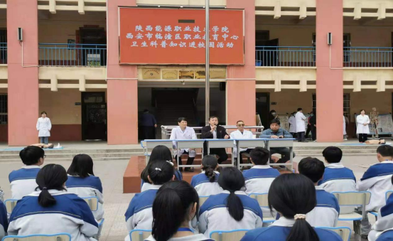 西安市临潼区职业教育中心(原新丰职中)是隶属于临潼区教育局的唯一一所公办市级重点职业学校。目前,在校学生一千余人,教职工一百零四人此次活动得到了临潼区职教中心的大力支持,政教中心孙健主任与实践教学处前期沟通,精心策划了本次医疗知识宣讲活动。该校师生对我校科普宣传表示热烈欢迎,现场参与师生900余人。