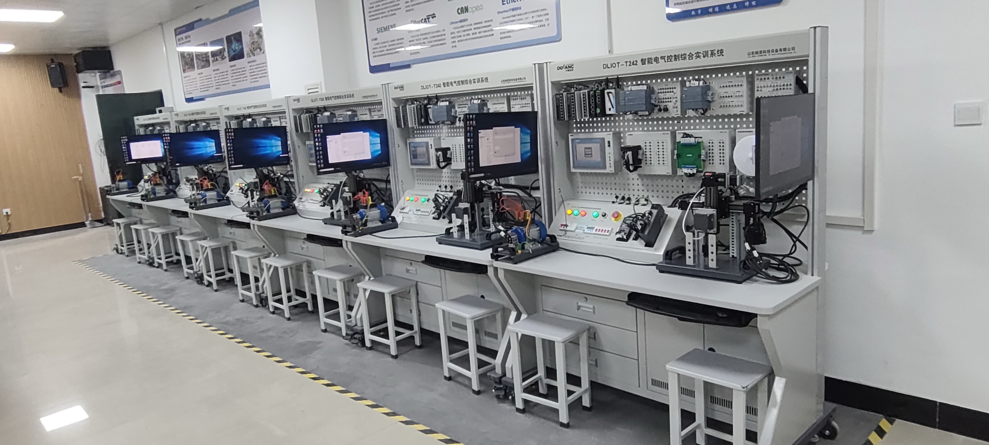 工业网络与智能控制实训室以工业级设备构建新型能源智能运维的仿真环境,集成MES系统实现全流程管控,并依托边缘计算与可视化平台完成实时数据处理与展示。网络层通过工业级交换机与无线AP构建可靠通信网络,保障各类设备的数据稳定传输。控制层以PLC为核心,联动远程I/O与HMI实现对能源转换、负荷设备的精准调控。感知层配备智能电表、环境传感器等监测设备,实时采集流数据,驱动变频器及运动控制系统等完成系统优化运行。系统覆盖“感知-控制-网络-管理”全链路,支持电气控制、数据集成与系统运维等综合实训,助力掌握新型能源背景下的智能化运维核心技能。