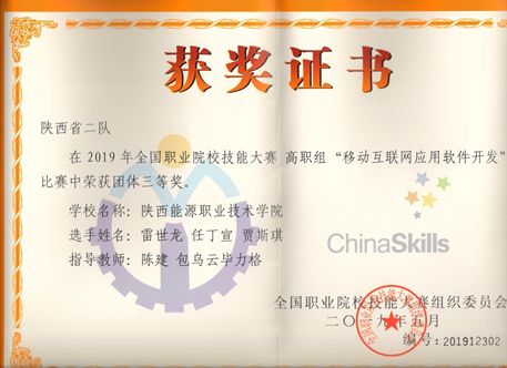 6月1日至3日,2019年全国职业院校技能大赛“移动互联网应用软件开发”赛项(高职组)在福建船政交通职业学院举行。我校机电与信息工程学院计算机网络技术专业贾斯琪、雷世龙、任丁宣同学喜获三等奖。