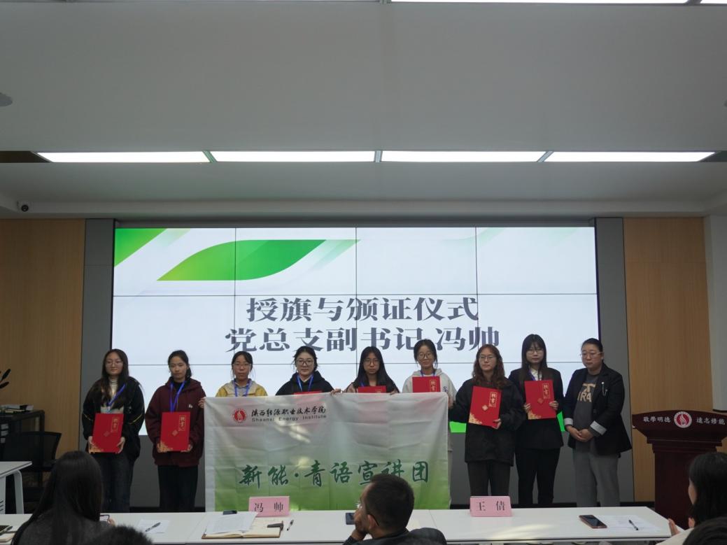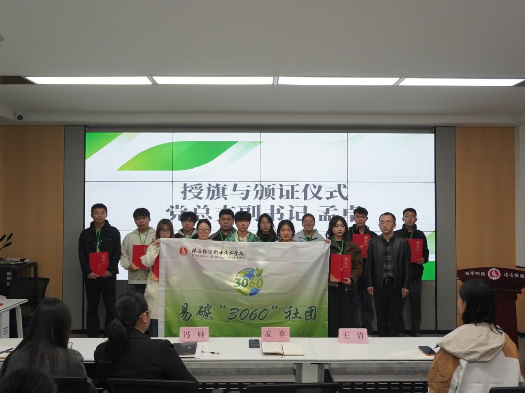 为深入贯彻落实“双碳”战略目标,扎实推进“一院一品”校园文化品牌“碳索未来 新能启航:校园绿色工匠培育工程”建设,打造具有新型能源学院鲜明特色的育人名片,2025年10月30日,学院在实训楼一楼博约堂隆重举行“新能·青语”宣讲团成立暨“易碳3060”社团授旗仪式。学院党总支副书记冯帅、孟卓,全体辅导员以及宣讲团、社团全体骨干成员共同见证了这一重要时刻。本次活动由学工办主任王倩主持。