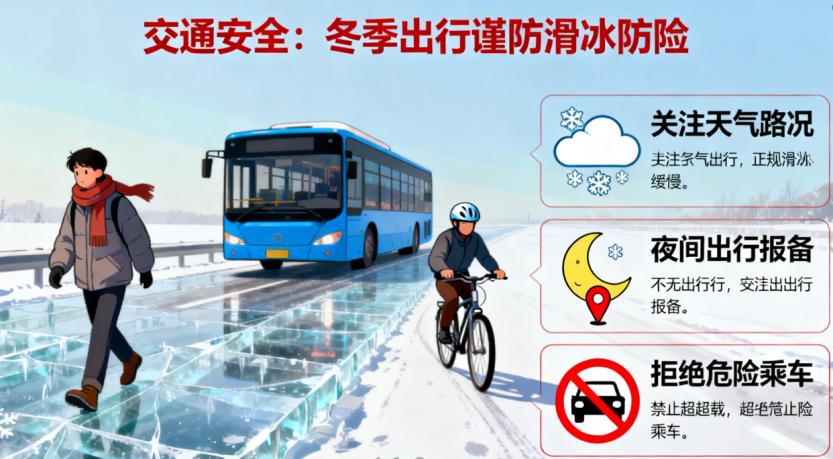 严格遵守交通规则:步行避结冰路面,骑行控速戴头盔,乘坐正规车辆,杜绝危险乘车行为;自驾或使用共享车辆需检查车况、谨慎慢行。