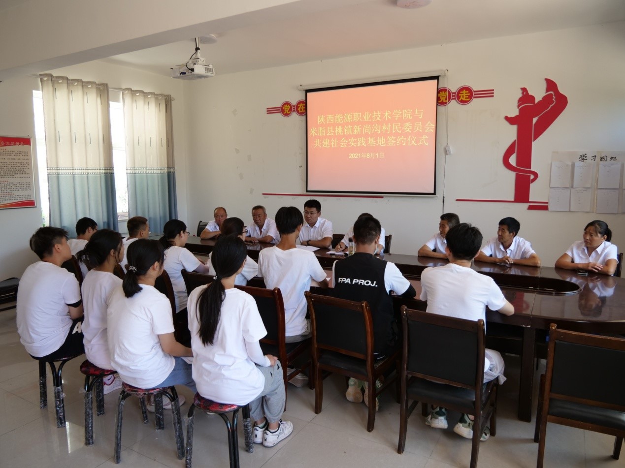 8月1日上午,陕西能源职业技术学院与米脂县桃镇新尚沟村村民委员会及米脂县米森农业发展有限公司在新尚沟村委会举行共建社会实践基地签约暨授牌仪式。新尚沟村第一驻村书记乔喜军、新尚沟村村支书、米森农业发展有限公司负责人、优秀校友任宏宇及村委会主要负责人、我校暑期社会实践带队教师景安琪、王倩及实践团成员参加仪式。本次仪式由暑期社会实践带队教师、智信学院学工办主任景安琪主持。
