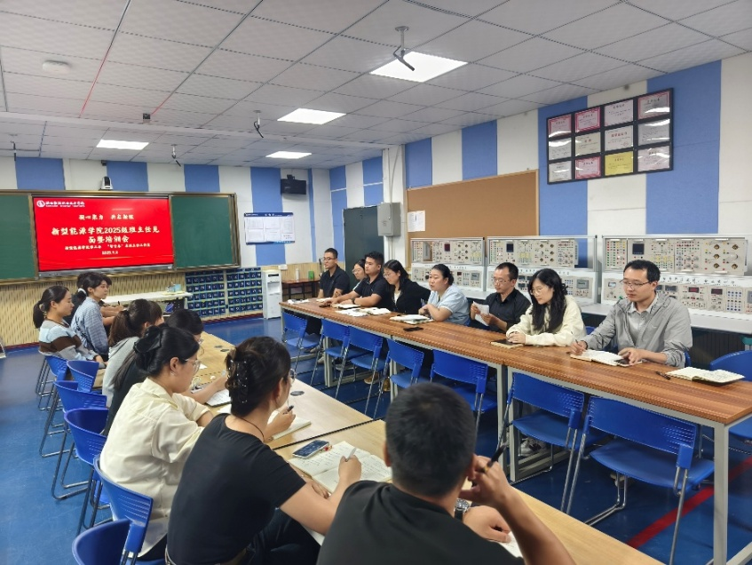 2025年9月2日下午,我院2025级新生班主任见面暨培训会在第一实训楼403教室顺利召开。本次会议聚焦迎新工作统筹部署、班主任岗位职责细化以及班级管理服务能力提升三大核心目标,学院党总支副书记冯帅、孟卓,学工办主任王倩、全体辅导员及新生班主任共同参会。