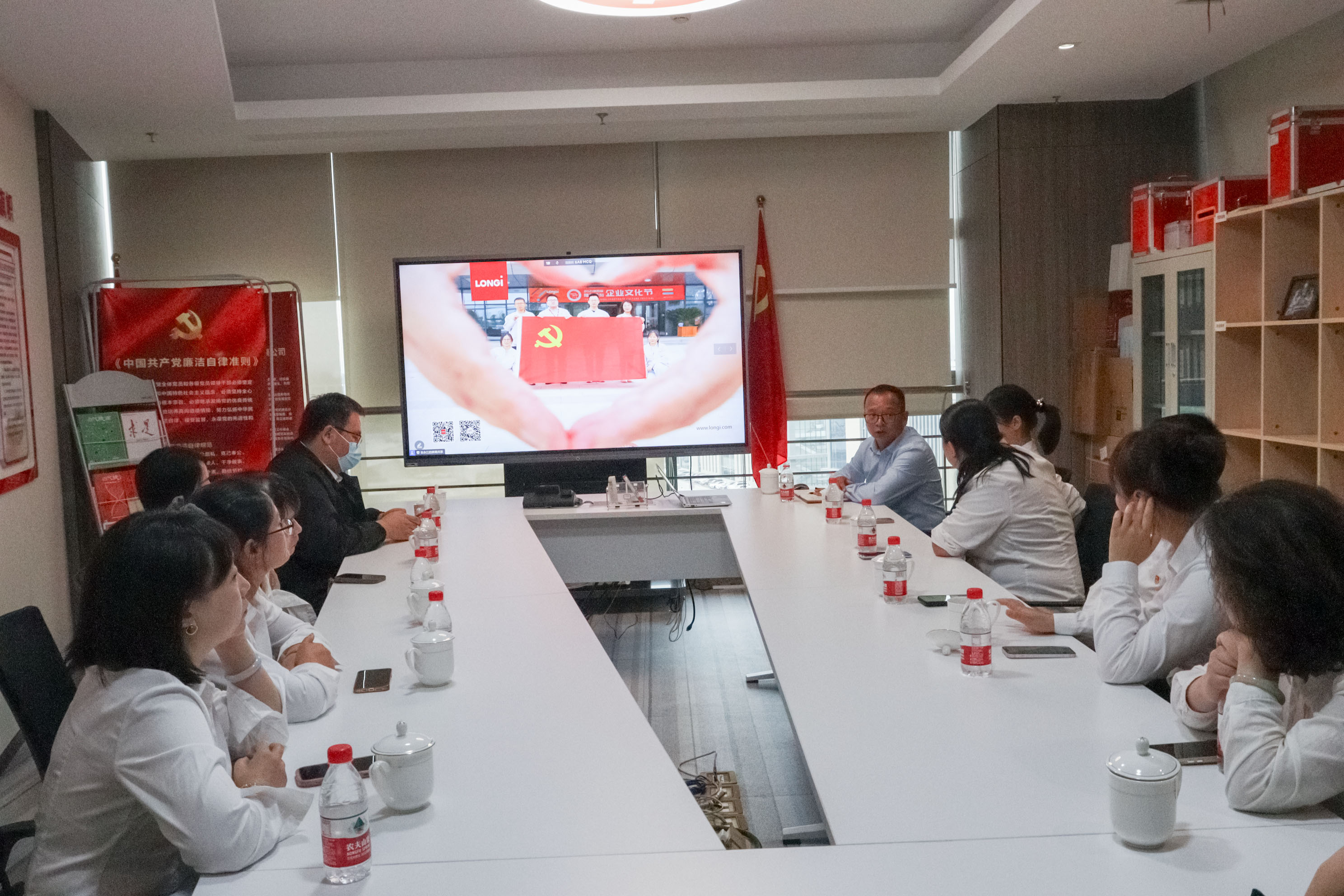 参观结束后,智信学院党总支及各支部委员与隆基绿能党委办公室主任张永江进行了党建工作交流。张永江详细介绍了隆基绿能在党建引领企业发展方面的成功经验和做法,为智信学院党总支提供了宝贵的借鉴。双方围绕党建工作经验和顶岗实习期间学生入党积极分子联合培养等议题展开了广泛而深入的探讨,为打通人才培养的“第三条通道”奠定了坚实的基础。