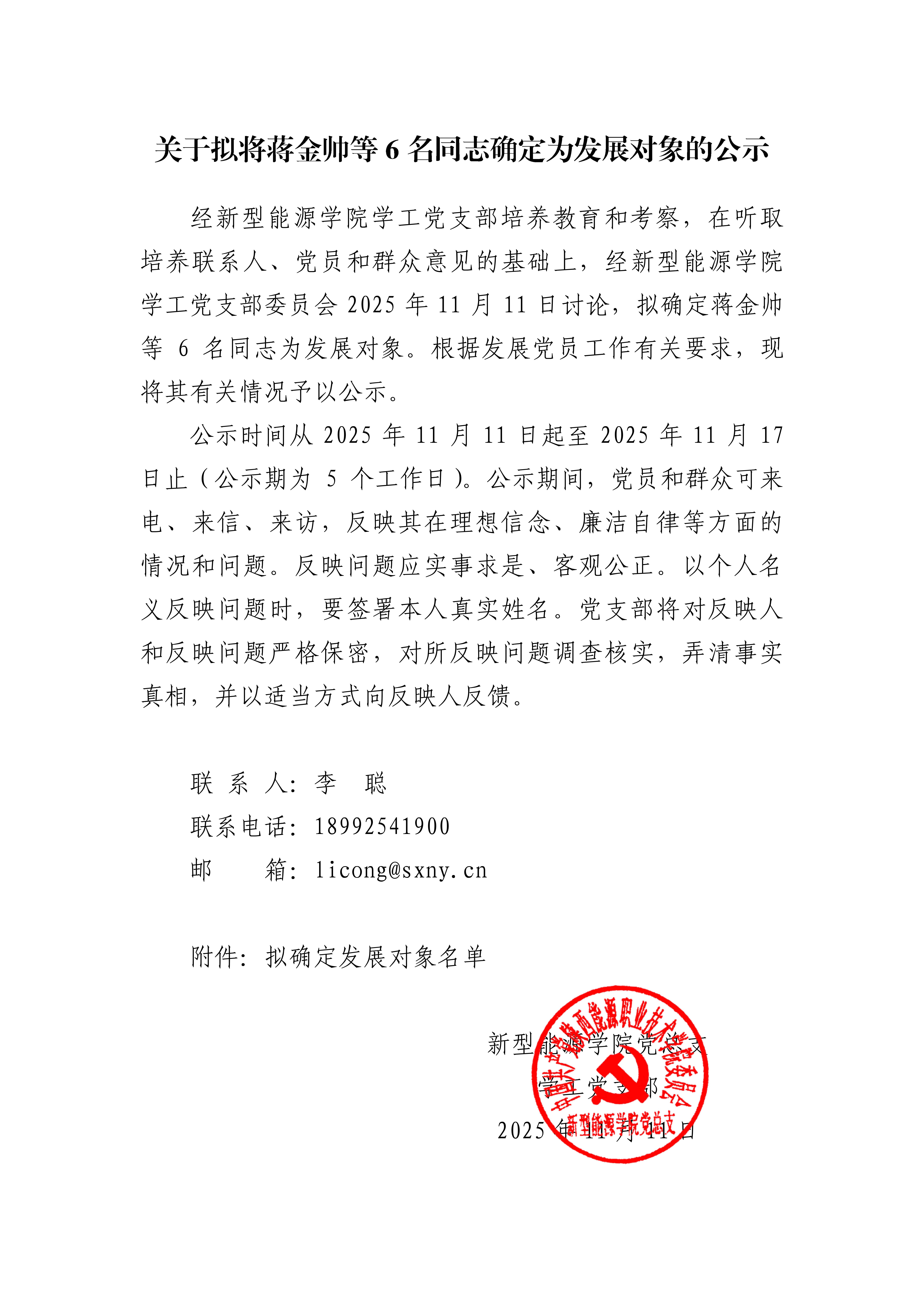 关于拟将蒋金帅等6名同志确定为发展对象的公示
