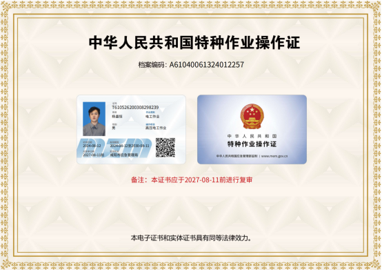 职业资格证书:高处特种作业证、低压电工特种作业证、高压电工特种作业证。