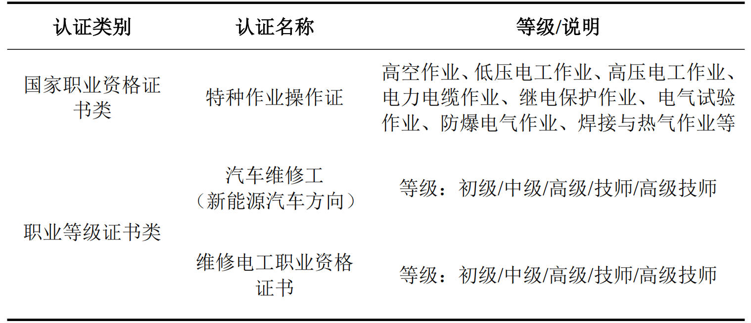 学院鼓励学生考取的职业资格及技能等级证书,以《国家职业资格目录》、“新能源类职业技能认证目录(学院鼓励类)”为准。