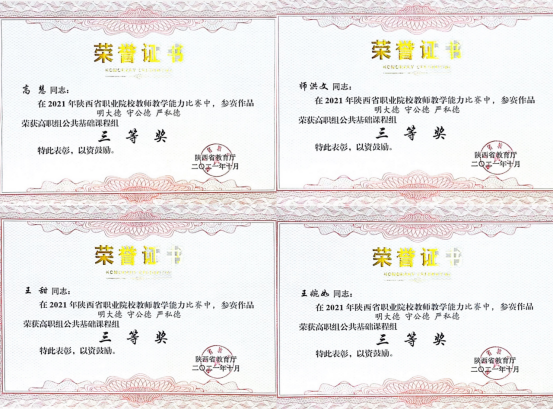 高慧、师洪文、王甜、王婉如等4位老师荣获陕西省2021年职业院校教师教学能力比赛三等奖