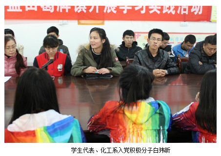 学生代表、化工系入党积极分子白玮昕紧随其后发言,她说:“长征是我们中国历史上无比壮观的历史画卷,是人类历史上史无前例的奇迹。我们今天来的都是党员、预备党员,入党积极分子,我们以后都将是中国共产党中的一员,我希望我们都可以做出表率。红军不怕远征难,万水千山只等闲。虽然参加过长征的老红军剩下的不多了,但老红军对我们的精神财富是永久的记忆。我们是祖国的主人,也是祖国的未来,祖国灿烂的明天也需要我们去建设。我希望我们更好地发扬长征精神,学好本领,努力奋斗,走好我们的长征路。......”