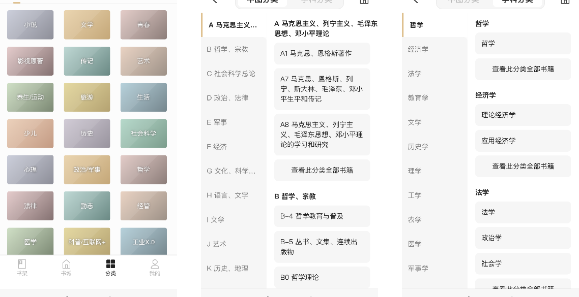 掌阅精选书籍提供三种分类方式,一是根据掌阅十余年的数字阅读行业经验,总结出21个大类、60个小分类的自有分类,方便读者查阅相关书籍;二是支持中图法分类,满足图书馆资源统计需求;三是提供学科分类,覆盖经济学、法学、历史学、理学、工学、农学等14个学科门类,可充分满足读者学习、教学与研究。