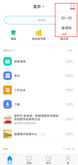 第二步,进入学习通首页,点击右上角“邀请码”,输入邀请snytsg,点击“确定”。