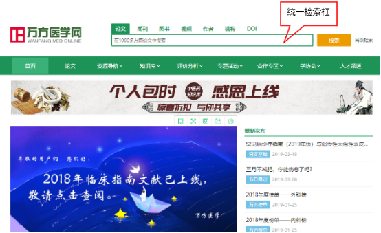 用户可在统一检索框输入关键词进行检索,将万方医学网所有数据库资源(如期刊、学位、会议等)集合到一起提供检索,也点击高级检索进行精准搜索。