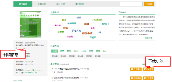 读者将所查询刊物搜索出后可以在界面点击统计分析、主题分析等模块查看刊物详细信息后可在线阅读,也可直接下载文献。