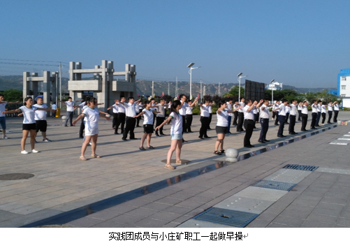 随后3天,实践团成员驻扎矿区,了解矿区职工生活情况,并矿区职工一起晨练早操、一同吃住,并对优秀代表进行专访和座谈,了解他们的成长经历、成功经验,追寻校友足记,启迪成功人生,为继承和发扬能源精神、共同推进学院发展、促进校企深度合作做出努力。