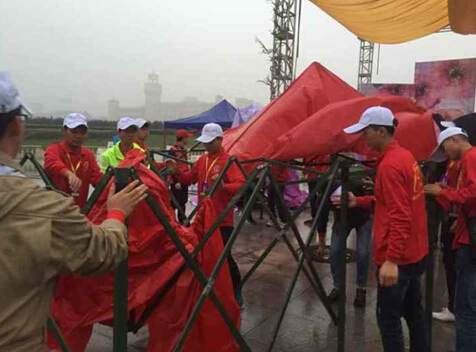 活动当天秋雨连绵,志愿者抵达活动场地后顾不上休息,迅速在活动现场搭建了40余顶帐篷为活动顺利开展提供了保障。
