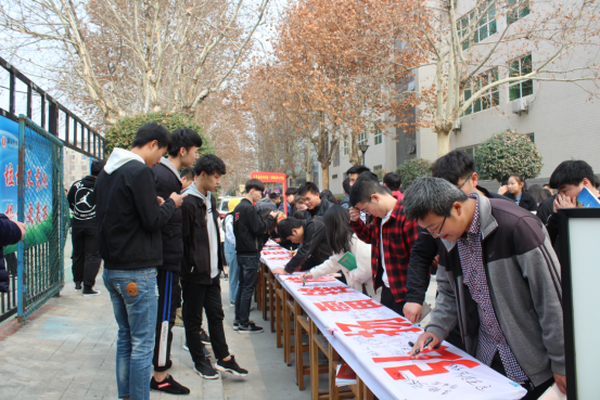 我校数千名团员青年在写有弘扬雷锋精神、创建文明校园的横幅上签下自己的名字。