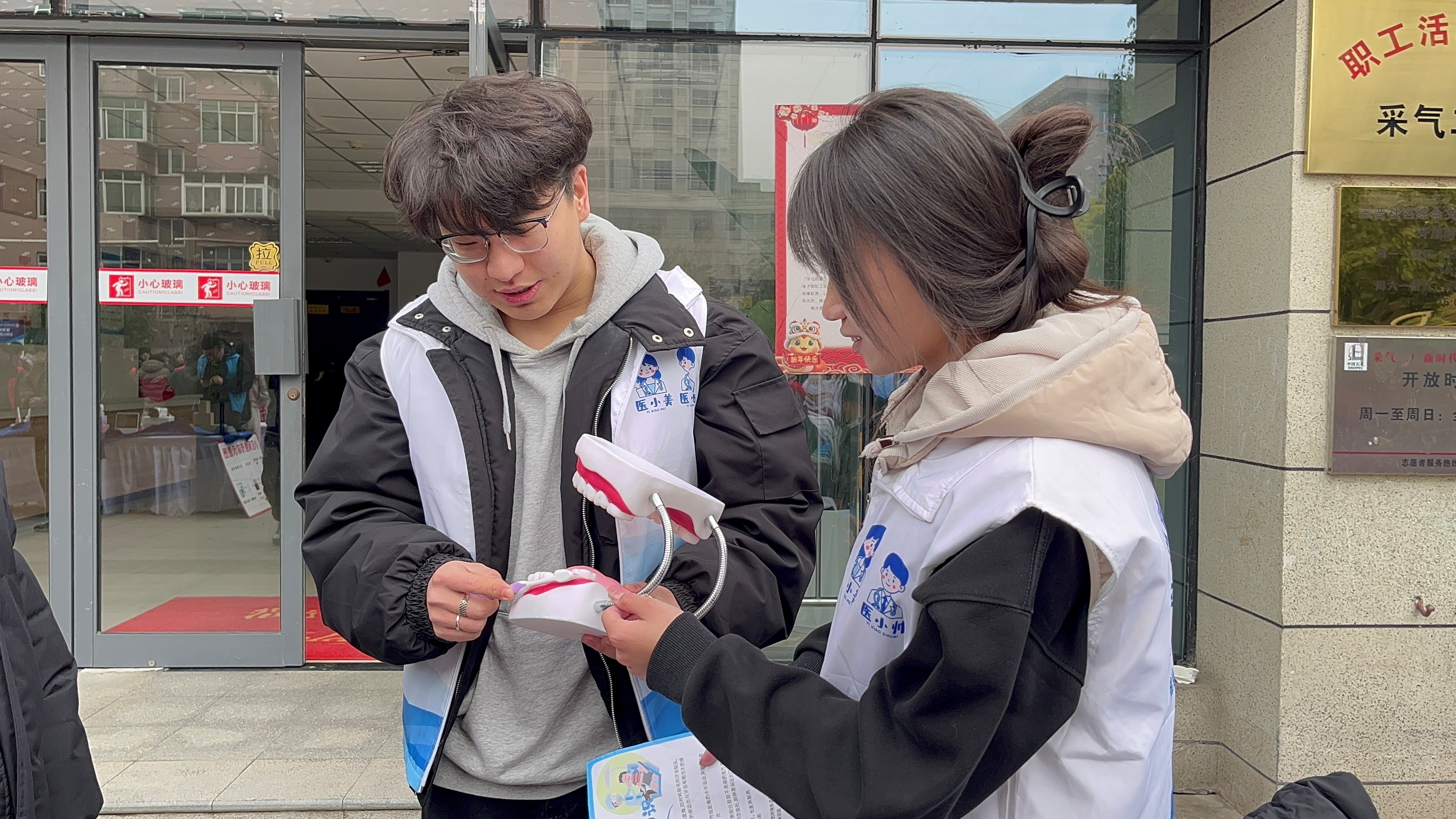 医学技术学院健康“医+1”志愿服务队在咸阳市三普社区搭建义诊区域,为市民提供血压、血糖测量等健康服务。志愿者们凭借扎实的专业素养,耐心询问居民身体状况,细致讲解健康知识,提供个性化的饮食与运动建议。口腔专业的同学们还化身“口腔健康小卫士”,现场演示巴氏刷牙法,传授科学刷牙技巧,帮助居民掌握正确的口腔护理方法。此次活动不仅提升了居民的健康意识,也让学生们在实践中深化了对“奉献、友爱、互助、进步”志愿服务精神的理解。