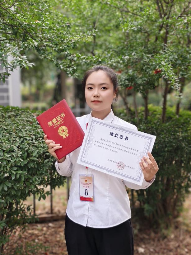 她督促同学学习,营造团结友爱的班级氛围,让托育2301班成为温暖又充满活力的集体。她组织学习小组,让同学们相互帮助、共同进步;她开展丰富多彩的班级活动,如文艺晚会、志愿服务活动等,增强班级的凝聚力和向心力。2023 - 2024学年,“十佳班风引领者”“三好学生”“优秀共青团干部”等荣誉加身,是对她工作的肯定,更激励着她继续为集体发光发热。