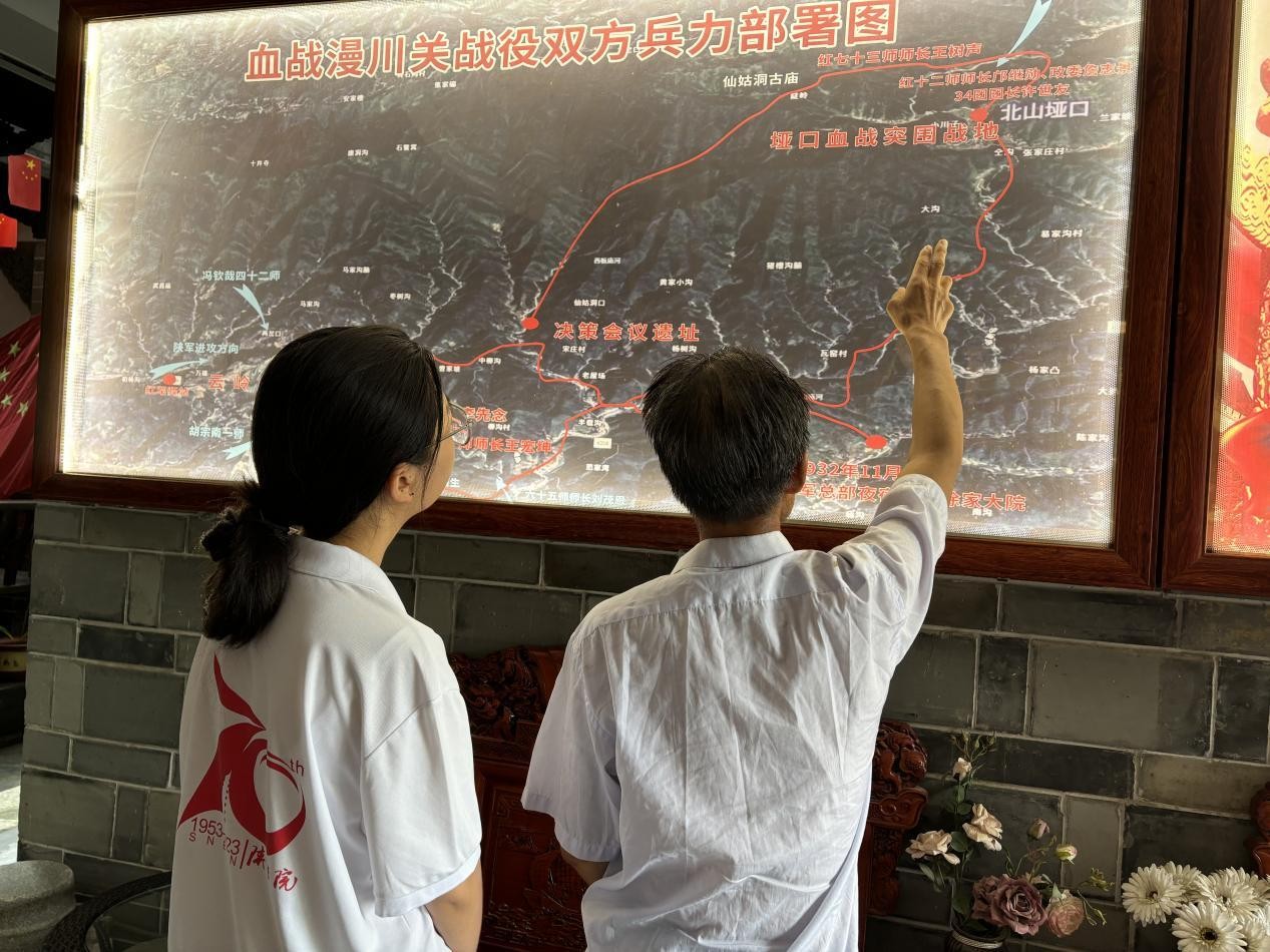 上午,实践团组织开展“漫川关战役”红色历史研学活动,特邀当地老党员为队员讲述发生在1932年的这场重要战役。老先生凭借丰富的历史积淀和生动的语言,为同学们系统梳理了战役的历史背景、激烈战况与战略意义,深情讲述了革命先烈奋勇抗争的英雄事迹。队员们认真聆听、详实记录,并在互动环节踊跃提问,与老党员进行深入交流。通过这场身临其境的历史课堂,同学生动感知了革命岁月的艰苦卓绝,深刻体悟了先辈坚定的理想信念与斗争精神。