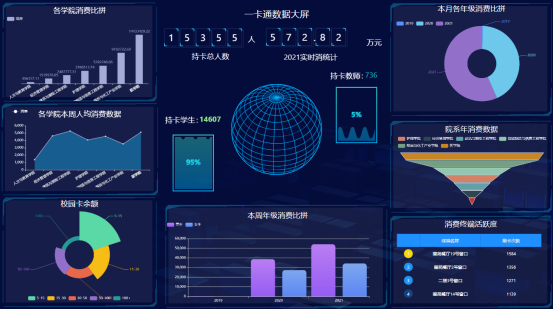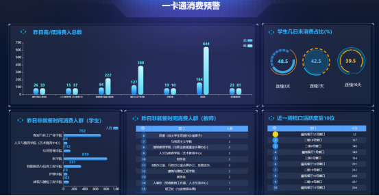 基于数据治理成效,建设包含校况、教师情况、学生情况、教学、科研、一卡通等在内的智能大屏监控系统,助力对校园环境、师生情况的智慧化管理。