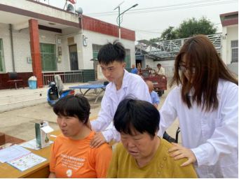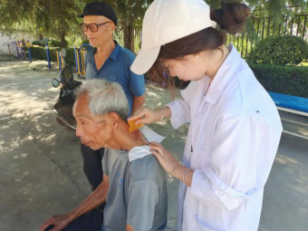 村民到齐后,实践队开始义诊。团队开展健康知识宣讲和常见病防治的科普,发放健康知识宣传册,帮助村民测量血压、血糖,为群众刮痧、按摩理疗,问诊后对症进行三伏贴的贴敷并讲解注意事项。期间,队员为排队等候的村民进行《农村医疗卫生状况调研问卷》的填写。最后,队员带领大家一起做颈椎保健操。