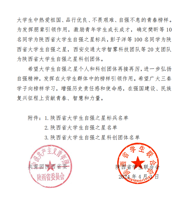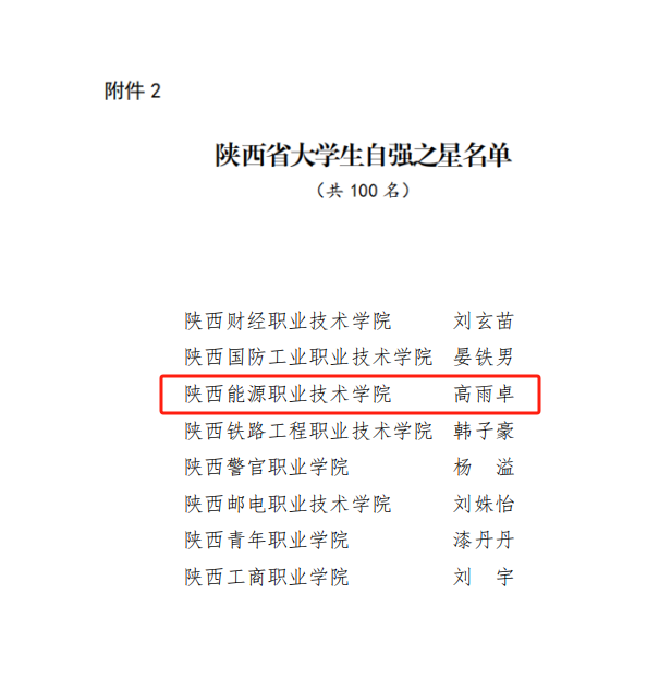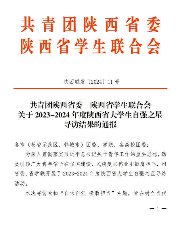近日,由共青团陕西省委、陕西省学生联合会发文,根据《关于2023-2024年度陕西省大学生自强之星寻访结果的通报》文件精神,我院高雨卓同学荣获“陕西省大学生自强之星”称号。
