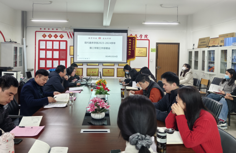 为做好新学期教育教学工作,切实提高教师业务能力与职业素养,落实工作责任,进一步推动学院高质量发展,2月24日,现代康养学院在办公楼409会议室召开2023-2024学年第二学期工作部署会,学院党总支书记唐恭贺、院长任春晓及全体教职工线上线下参会,会议由综合办主任彭晨主持。