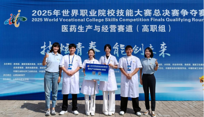 2025年8月27日至2025年9月1日,2025年全国职业院校技能大赛医药生产与经营赛道(高职组)全国总决赛在山西药科职业学院成功举行。本次大赛汇聚了来自全国120所高职院校的154支代表队同场竞技。由我校医学康养学院副院长赖菁华带队,指导教师年婧、杨晓文,以及张辰鹤、郭雅萱、苟正维、曹益铭四位同学组成的师生代表队团结协作、沉着应战,凭借扎实的专业功底和出色的临场表现,最终荣获银奖!