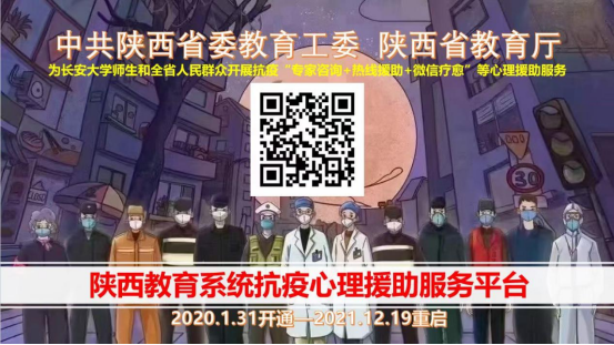 近日来,省内疫情防控形势严峻,部分高校师生情绪及心态受到较大影响,对心理援助服务的需求不断增加。中共陕西省委教育工委、陕西省教育厅主办“陕西教育系统抗疫心理援助平台”委托陕西省高校心理素质教育研究会于2020年1月31日开通以来,取得去年抗疫心理援助阶段性成果。因目前我省抗疫需要,陕西省高校心理素质教育研究会于2021年12月19日晚8点重启抗疫心理援助平台。