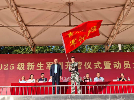 最后,校党委副书记、2025级军训团政委任向明同志授团旗,并宣布2025 级新生军训开营!