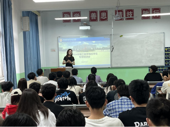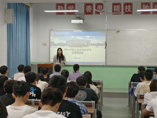 为进一步贯彻落实《学校资助育人“春雨行动”工作方案》的通知,提高学生资助管理中心勤工助学岗位学生的业务技能和综合素质,充分发挥勤工助学育人功能。2024年4月24日,在咸阳校区教学楼109、临潼校区教学楼103召开2024年勤工助学岗位专题培训暨陕能院勤工助学中心社团启动仪式,学生处副处长王晶、学生资助管理中主任景安琪,干事刘阳出席本次会议,一百五十余名勤工助学在岗学生参与此次培训,会议由景安琪主持。