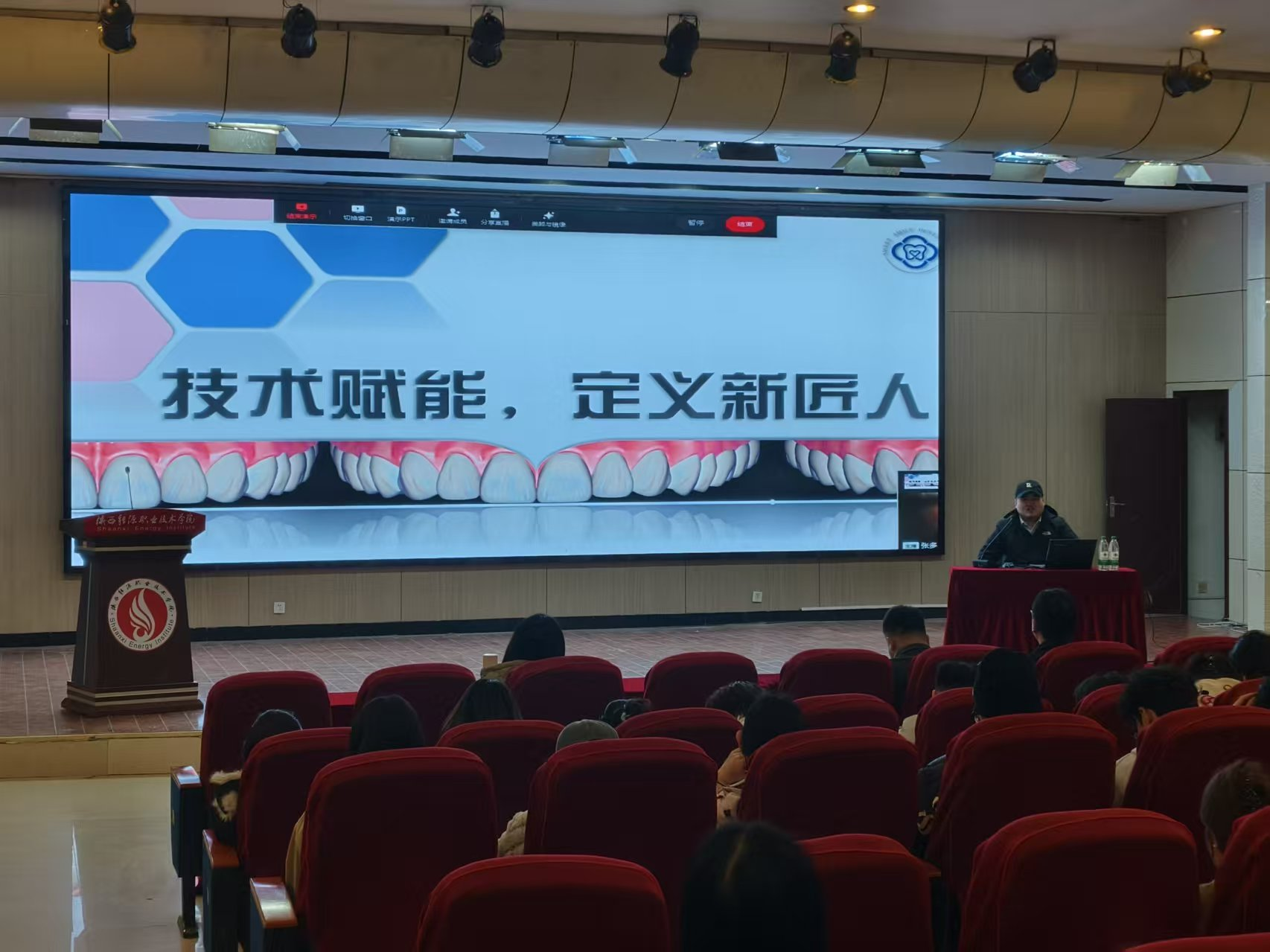 11月6日,医学技术学院在第一实训楼六楼报告厅成功举办 “承榜样之光,拓就业之路——优秀校友与你面对面”职业生涯规划教育暨就业教育宣讲会。本次宣讲会特邀陕西东宸臻美医疗科技有限公司总经理程东雷与数字化设计中心主管袁孟轩两位优秀校友倾情分享,采取线上线下相结合方式进行,医学技术学院党总支副书记张多、学工办主任蒋文、班主任以及全体口腔专业学生参会,活动由张多主持。