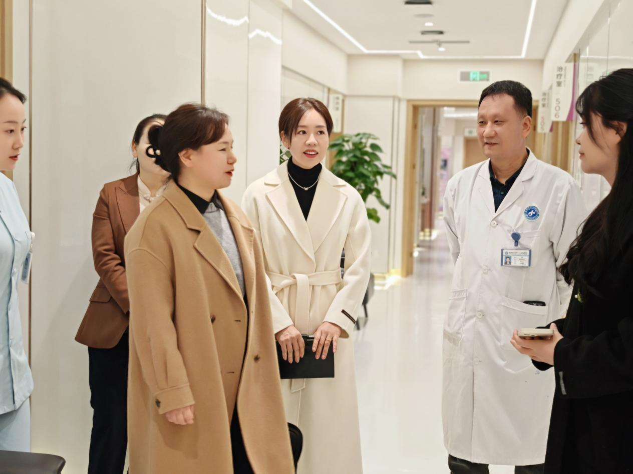 会前一行人参观了医学美容科,王炜介绍了美容科诊疗环境、美容医疗设备以及科室管理流程等。