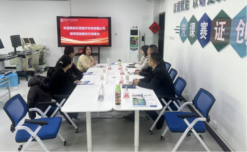 随后,学院领导、专业带头人及教研室主任一行前往西安乐思医疗科技有限公司回访交流。在企业负责人的陪同下,校方团队实地参观了企业生产基地,深入了解智能医疗设备的研发流程与生产工艺,直观感受行业前沿技术与产业发展趋势。双方还在企业会议室举行座谈,就课程体系优化、企业导师聘请、产教融合项目合作、科研项目转化等内容达成多项共识,为后续构建“校企协同、育训结合”的人才培养长效机制明确了路径。