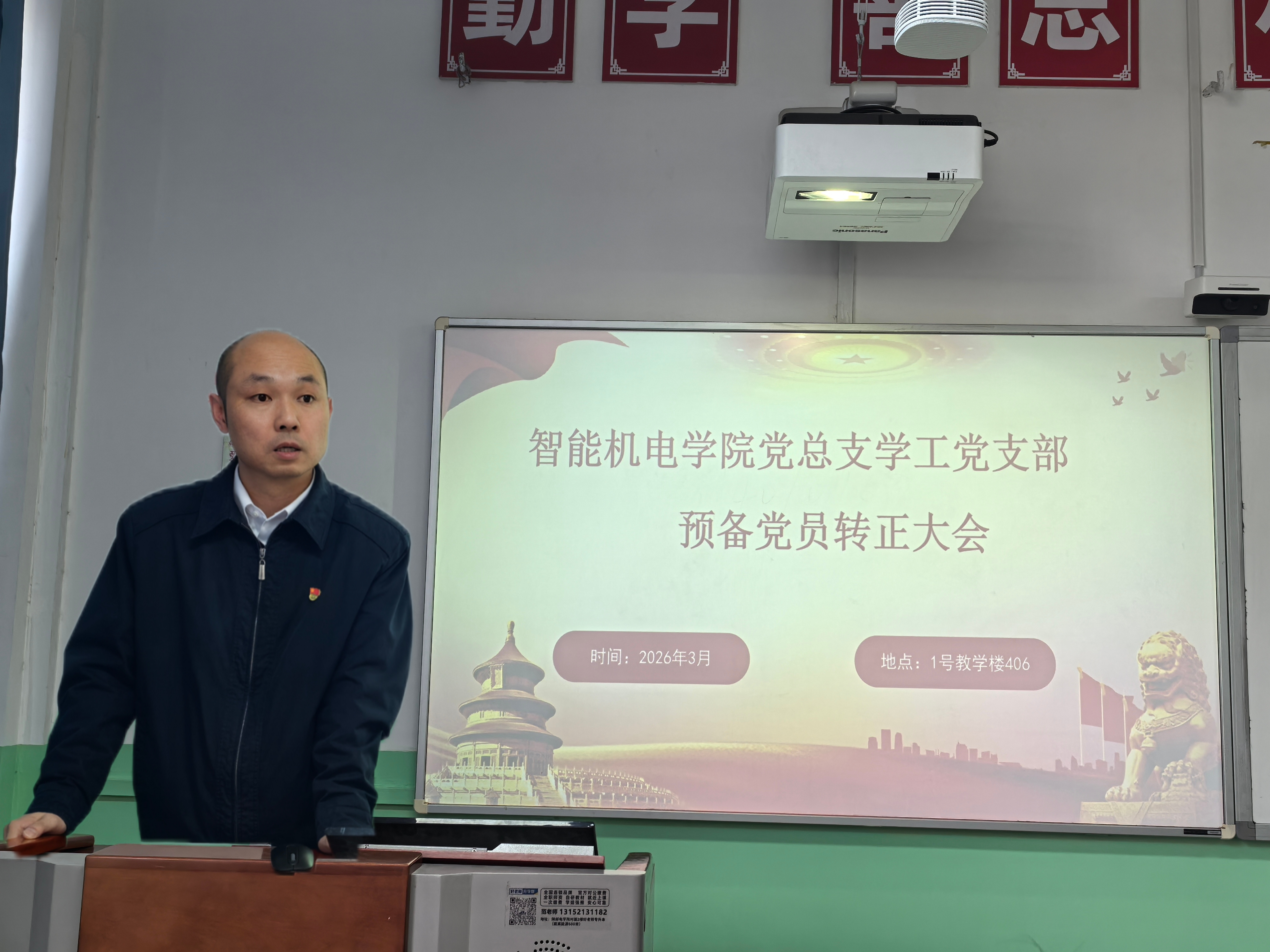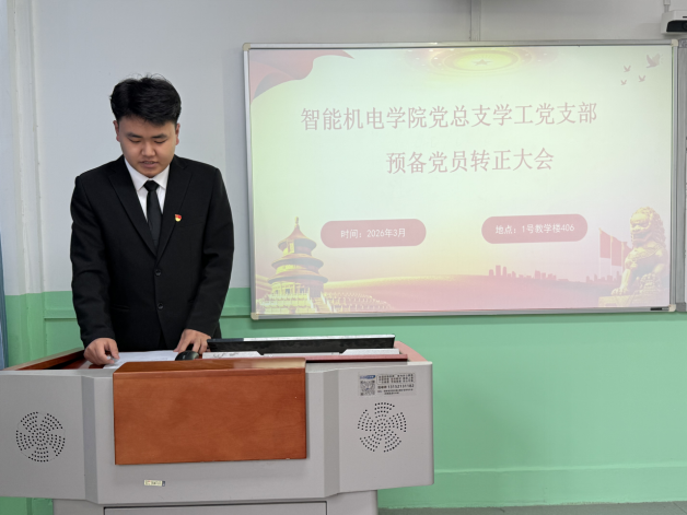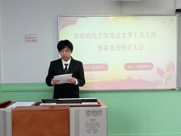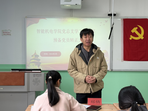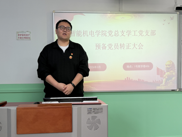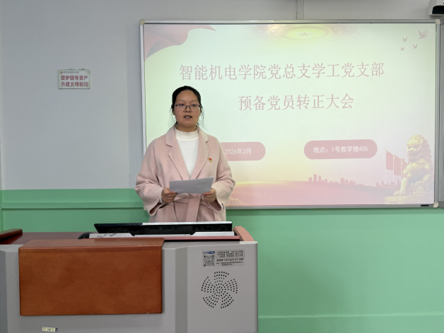 2026年3月18日下午,智能机电学院党总支学工党支部在1号教学楼407教室召开2026年预备党员转正大会,专题讨论申锦江等五名预备党员转正相关事宜。会议由学工党支部组织委员尹艳玲主持,学工党支部全体教师党员、入党介绍人及本次转正预备党员出席会议,学院党总支副书记王皓天、焦娇参会指导。