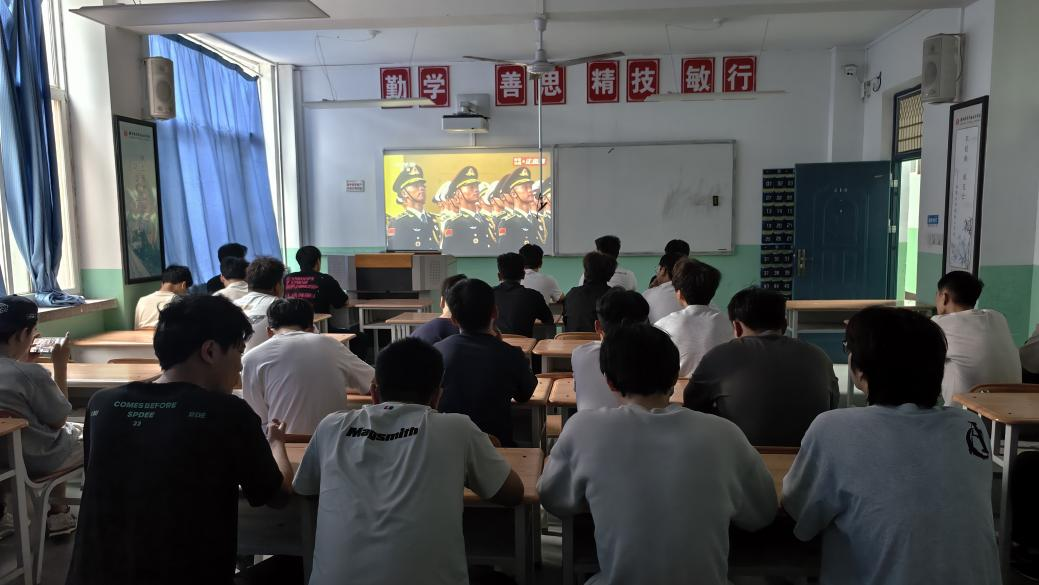 当天上午,智能机电学院办公室、学工办办公室内,老师们早早地聚集在一起,怀着激动的心情等待阅兵开始。与此同时,学院以班级为单位,组织学生们在教室统一观看阅兵仪式,同学们整齐地坐在座位上,目光紧紧地聚焦在屏幕上。还有部分学生在家自行观看了阅兵直播。