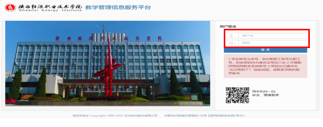 1.学生登录“陕西能源职业技术学院”官网,点击“教育教学”,进入“教学管理”界面,登录“教务管理系统”。