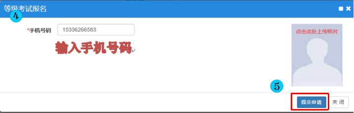 2.进入学生界面后,点击“报名申请-考级项目报名”,选择报名考试的种类并根据要求填写手机号码,确认信息后点击“提交申请”后便报名成功。