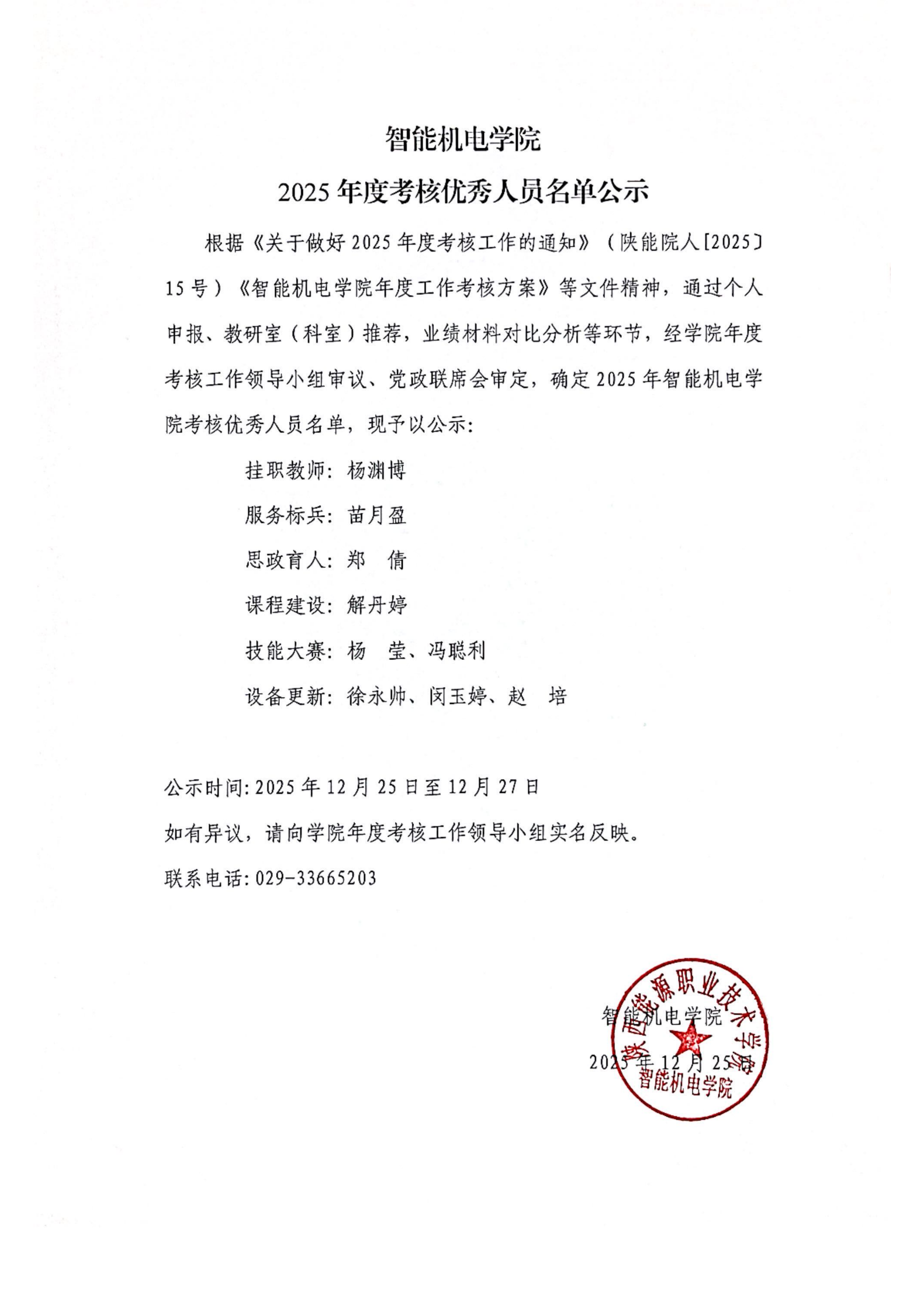 智能机电学院2025年度考核优秀人员名单公示