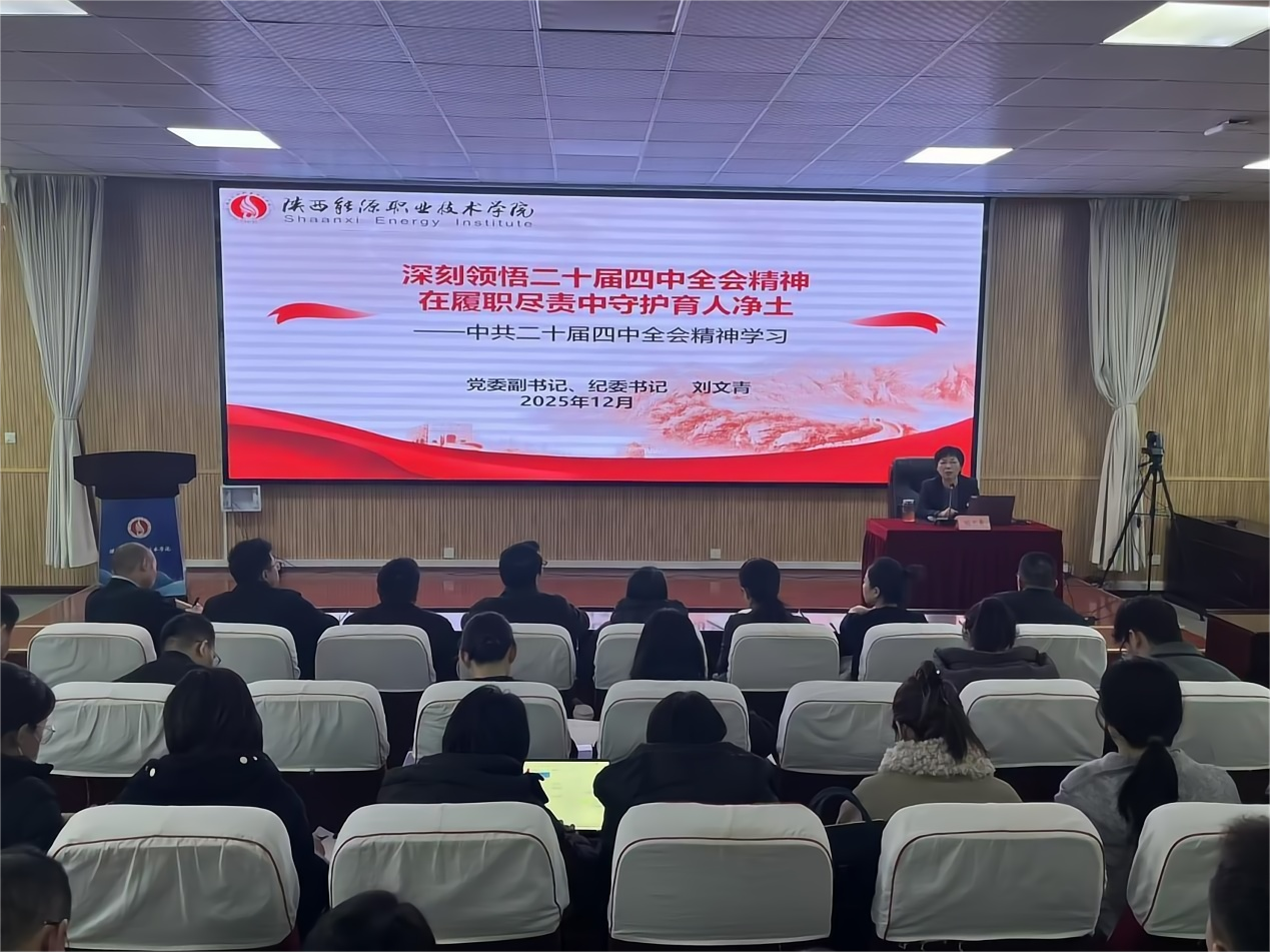 为推动党的二十届四中全会精神在学校基层党组织落地生根,切实把纪律建设融入二级学院教育教学、技能人才培养全过程,2025年12月24日下午,校党委副书记、纪委书记刘文青以“深刻领悟党的二十届四中全会精神 在履职尽责中守护育人净土”为题,为智能机电学院党总支、纪检党支部全体党员开展专题党课宣讲。
