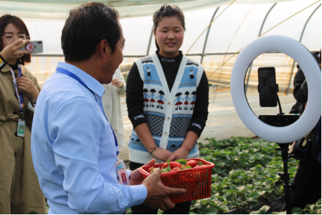 通过上午理论课的讲授,为了能够稳扎稳打的让学员掌握直播的实践操作,巨校长带领一行人来到了兴平市永宏草莓基地开展了现场直播带货演示,在电商师生的协助下,一个临时直播间搭建在了田间地头的草莓帐篷里,电商学生化身带货小主播,帮助草莓种植农户快速进入直播状态,让农户真实的体验了一次当“带货主播”的感受。