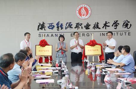 朱忠军与宋虎杰,为陕西能源职业技术学院和西安中医脑病医院共建的“健康产业学院”揭牌;张普礼与香港雅姬乐集团有限公司副总经理潘菲菲,为陕西能源职业技术学院和香港雅姬乐集团有限公司共建的“美容产业学院”揭牌。