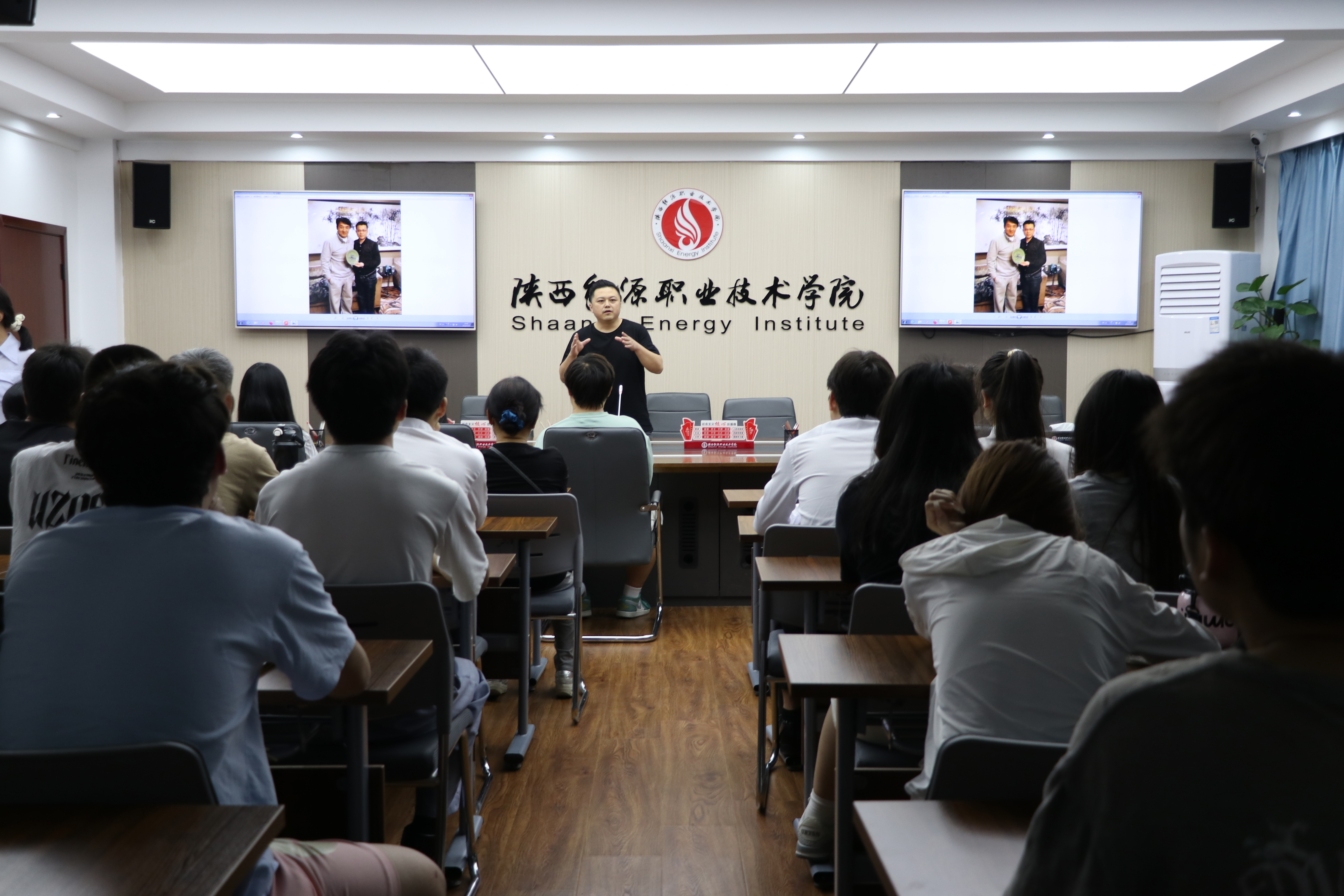 言实老师通过图文实物的形式将耀州窑的历史发展及烧制技术做了介绍,讲解了如何将陶瓷元素融入到现代室内设计中。将中国陶器与现在时尚碰撞、进行跨时代的审美结合,同时分享了自己在耀州窑之路的成长经历和工作实践心得,勉励大家学好一门技术,勇于担当、爱岗敬业、刻苦专研,时刻以“工匠精神”要求自己。