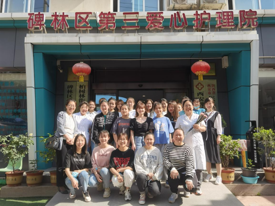 5月23日,护理学院副院长李宏力、护理教研三室(老年、康复方向)主任马雪雪及护理学院教工党支部组织委员傅月玥带领2019级护理专业老年方向班21名学生,走进碑林区第三爱心护理院参观学习,并慰问陪伴老人,以增加学生对养老的认知,提升爱老、敬老、孝老的情怀,为即将到来的实习做好准备。
