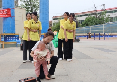 同学们带来童话剧《真假美猴王》,以生动的表演点燃了孩子们的热情。剧中穿插互动问答与情景参与,小观众们争先恐后“辨真假”,在趣味中感受经典故事的魅力。亲子活动环节以“儿歌+奥尔夫音乐”组合形式展开。乾县职教中心教师带领家庭齐唱《饼干圆圆》,通过音乐与动作结合,培养婴幼儿语言与节奏感;《小动物叫声》打击乐活动中,孩子们手持铃鼓、碰钟等乐器,在音乐游戏中激发创造力。科学实验活动成为全场焦点。学生们现场演示“马德堡半球实验”,家长与孩子合力尝试拉开抽气后的半球,直观感受大气压力的神奇;在“空气炮”制作环节,塑料瓶与气球变身为趣味工具,孩子们瞄准纸杯目标发射“空气炮弹”,在实践中领悟物理原理。活动特别设置《海姆立克急救法》科普课堂。人文教育学院与乾县学生携手演示急救操作方法,详细讲解婴幼儿异物卡喉的应对步骤。现场分发模拟娃娃一共家长们操作练习。多位家长亲身实操,在师生指导下掌握急救技能。