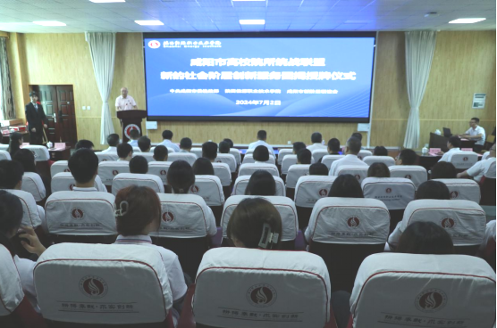 7月2日,咸阳市高校院所统战联盟新的社会阶层创新服务团揭授牌仪式在我校顺利进行。服务团主要由我校12名教师组成。陕西省委统战部副部长崔亦国、六处处长赵健、六处三级调研员刘敏,陕西省教育工委统战部二级调研员艾天浩,咸阳市市委常委、市委统战部部长王春霄、副部长郭力峰,咸阳市新联会会长淡朝晖、副会长常晋海、张巍宇、刘松灵,我校党委书记刘予东、党委副书记任向明、相关部门负责人、服务团教师成员参加仪式,仪式由任向明主持。
