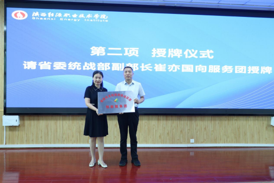 咸阳市委常委、市委统战部部长王春霄讲话。他表示陕西能源职业技术学院是一所扎根咸阳、面向全国,具有71年光辉历史的知名高等职业院校,近年来在学科建设、人才培养、服务社会取得诸多成果,具备开展高校统战工作的重要基础和人力资源,在陕能院成立咸阳市第一个新的社会服务基层创新服务团绝对不是应景之作,而是应运而生。王春霄强调,成立新的社会阶层创新服务团是咸阳市高校院所统战联盟工作深化实化具体化的重要举措,是新的社会阶层人士融入服务大局的重要平台。要聚焦“创新”最大化彰显优势,完整准确全面贯彻新发展理念,积极发挥人才、技术、信息等特有优势汇智聚力。聚焦“服务”精准化助力赋能,围绕大局所需、民生所急深入调查研究,积极建言献策,多提供前瞻性、科学性强的决策预案。聚焦“互动”常态化务实推进,探索建立持续紧密合作机制,双向奔赴、同题共答、彼此成就。